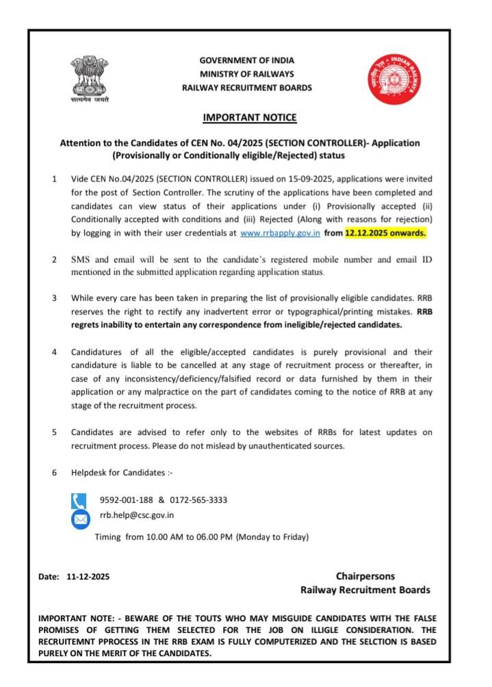 RRB Section Controller Recruitment 2025 Application Status Out – Check Now